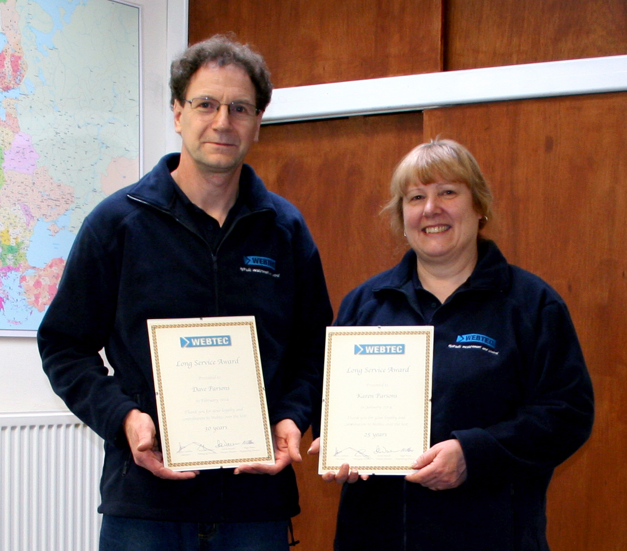 Webtec, the St Ives based manufacturer of hydraulic measurement and control products recently awarded Dave and Karen Parsons, both assembly supervisors at the company, 30 year and 25 year long-service awards respectively.